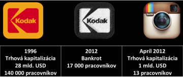 Ešte v roku 1998 si nikto nemyslel, že digitálne fotoaparáty ovládnu trh a do troch rokov bol koniec. Kodak nezničila nová technológia, ale jeho neschopnosť reagovať na exponenciálnu zmenu, ktorú táto technológia priniesla. Takto fungujú exponenciálne technológie – najskôr sa zdá, že sa nič nedeje, potom príde šok a radikálna zmena.