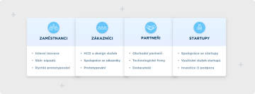 Kooperaci rozlišuji na 4 segmenty – jak kooperovat s partnery, jak se zákazníky, jak s technologickými firmami a jak se startupy.