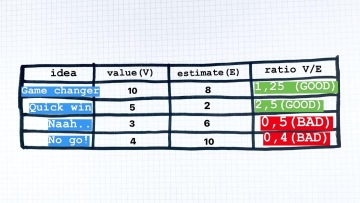 The evaluation part is quite simple — anything with the score of 1 or higher is worth doing (i.e. it has bigger value then estimate). Anything between 0 and 1 is not worth doing. But you can be more or less strict for sure, it's completely up to you.
