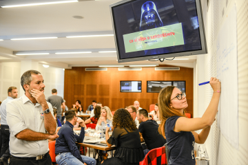 Martin: Určitě nás odlišuje ten designový záměr – od začátku budovat spolupráci mezi lidmi a prostředí postavené na kultuře MY. Potom je to praktičnost questů. My je tlačíme, aby si něco prožili tady a z toho udělali nějaké shrnutí a reflexi. Potom si to prožijí znovu v questu, zase si nad tím udělají reflexi a ještě k tomu sdílí dojmy mezi sebou. Další silnou stránkou je, že do toho vtahují svoje pracovní týmy, takže ten program nezasáhne jen 50 lidí, co tady sedí, ale vynásobí se to třeba pěti, sedmi, deseti, podle toho jak velké mají týmy. Zároveň budují vztahy mezi sebou a ta dynamika pak pokračuje, když se potkají v bance.