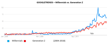 Poslední tři čtyři roky se z každého druhého „bórdrůmu“ ozývalo unisono: „Co vlastně chtějí ti mileniálové? Proč pro ně nejsme atraktivní? Jak s nimi máme komunikovat? A zajímají je vůbec ty naše služby?“ Kolik otázek, tolik odpovědí. Nevím, co zde bylo dřív, zda vejce nebo slepice, ale internet je zaplaven kupou článků, analýz, zamyšlení a doporučení – CO S TÍM? Zadal jsem si mileniály do Google trends a graf dole ukazuje se, že tahle mileniálová horečka dosáhla svého vrcholu někdy na konci roku 2016. Od té doby klesá. Ptáte se proč?