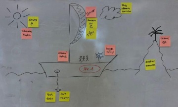 Představte si, že máte jako tým za úkol nakreslit loď. Facilitátor vás požádá, abyste na obrázek k trupu lodi přikreslili velké plachty, kormidlo, kotvu a v neposlední řadě také útes před lodí. Poté dostanete za úkol napsat na lístečky vše, co pro vás bylo důležité za uplynulý sprint, ať už pozitivní nebo negativní. Jakmile máte napsáno, vezmete lístečky a lepíte je na ty části lodi, které nejlépe vystihují podstatu lístečku. Například “plachty nás pohání kupředu, a proto zde dávám automatické testy, protože nám výrazně pomáhají a vše urychlují” nebo “táhne nás ke dnu spousta byrokracie”, proto dávám ke kotvě.