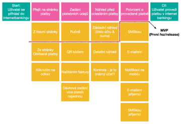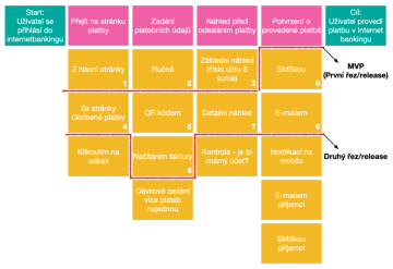 - Vyznačte na mapě první nejmenší řez zleva doprava, kterým je zákazník schopen dosáhnout definovaného cíle – vzniká MVP release (na obrázku znázorněn červenou čarou).